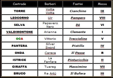 [...] Troppo facile indicare in una mossa impossibile il motivo dominante della carriera dedicata alla Madonna di Provenzano. La sorte maligna con il debuttante Turner regalava la nona posizione alla TORRE infilzando l'ONDA di rincorsa. Per il debuttante mossiere il compito diventava durissimo. Il Pesse doveva cercarsi un pertugio nel quale infilarsi, evitando nel contempo che Cianchino potesse azzeccare un buon tempo di partenza. Era tutto un roteare di occhi, di ammiccamenti, di inviti pressanti, di indugi, di finte e controfinte, mentre al centro dello schieramento OCA e GIRAFFA godevano della massima libertà. Il Palio più <<politico>> del secolo, ricordiamo la presenza di Prodi e Jospin, rischiava il rinvio, ma poi Il Pesse trovava un pizzico di coraggio ed era subito OCA [...]