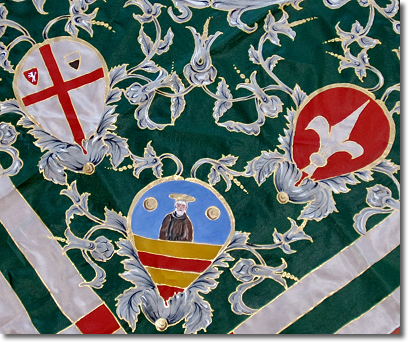 Sull'altro spiccano i bellissimi e coloratissimi stemmi delle compagnie militari di San Pellegrino e Sant’Antonio e l’alabarda triestina.