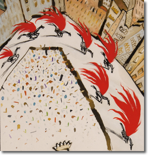 E il drappellone? Con quel nastro tricolore che avvolge la Madonna e le tre mele anch'esse tricolori. Anche se, a voler essere precisi, il rosso è più arancio. Però la Selva non corre e la composizione dei colori è quella della bandiera dell'Oca. E la Madonna/Italia con quell'elmo "di Scipio" che assomiglia tantissimo a quello del Duce della Comparsa dell'Oca?